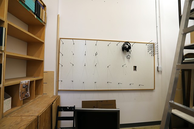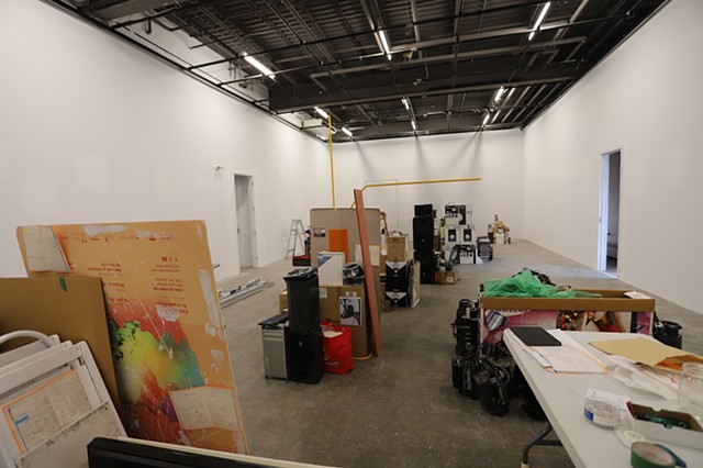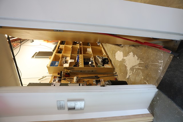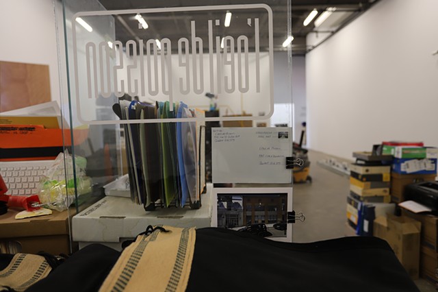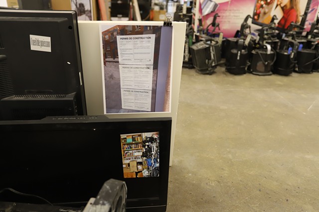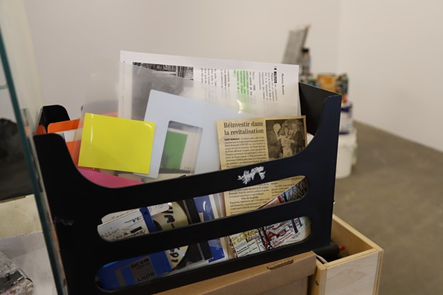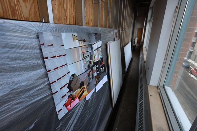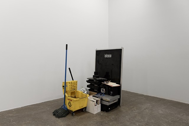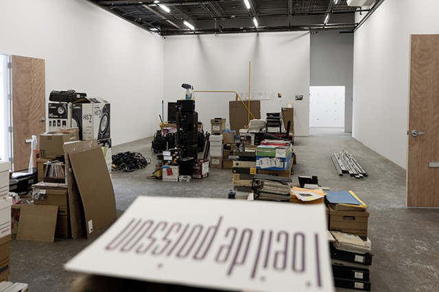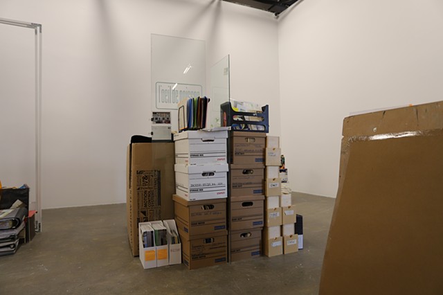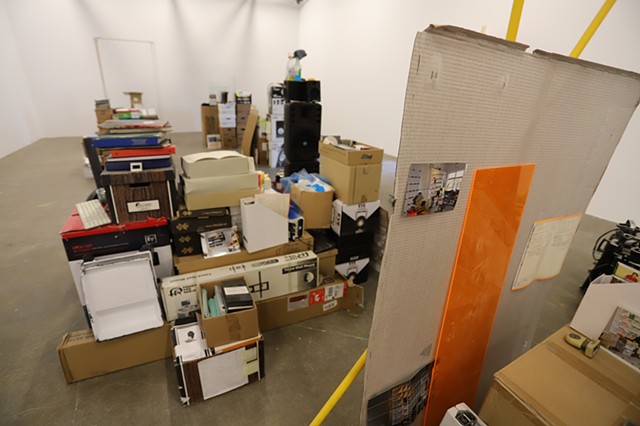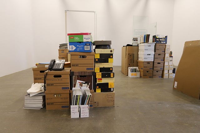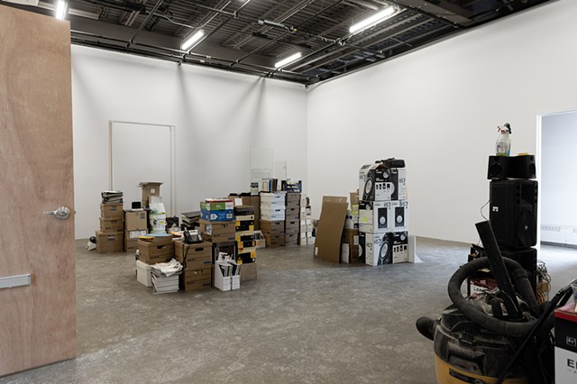 To make the exhibition I moved all of the items in the storage areas surrounding the exhibition space into the main gallery. Stacks of boxes of storage supplies, of current and obsolete technical equipment, archival materials, accounting documents, and bric-a-brac from over thirty years in the same space all came to light in the gallery. The white cube of the gallery space is constructed as an enclosure within a building that has exterior facing windows. I built doors that penetrated this envelope and provided access to the intermediary space between the gallery and the outside-facing windows. As part of this activity of bringing the structures of gallery-making and gallery-legitimating into the gallery, I also incorporated printed images that documented the gallery in previous states of disarray into the sculptural collage within the exhibition space.