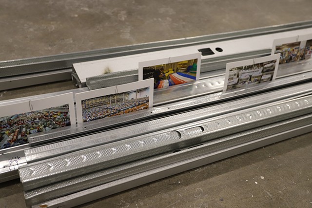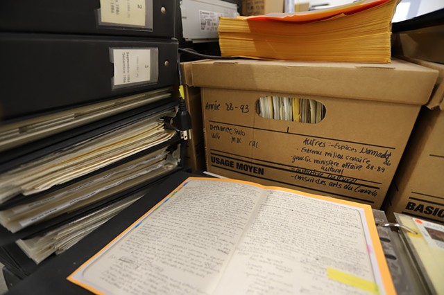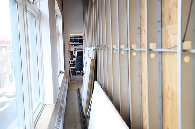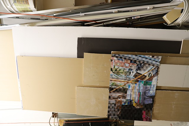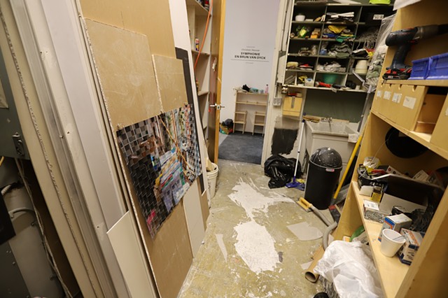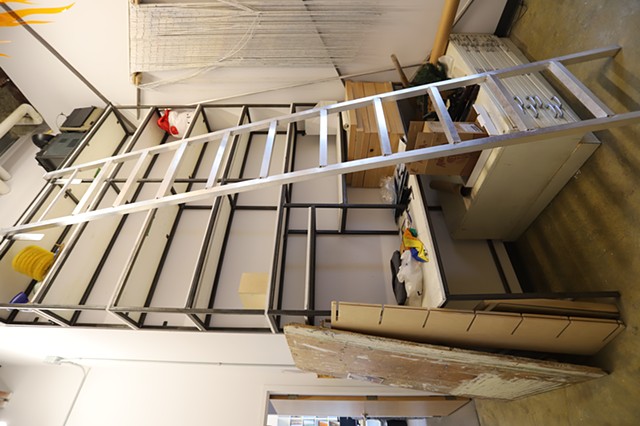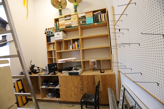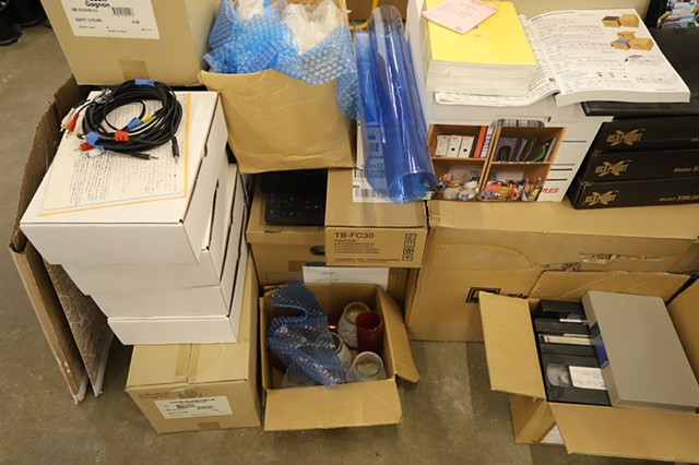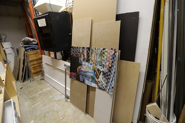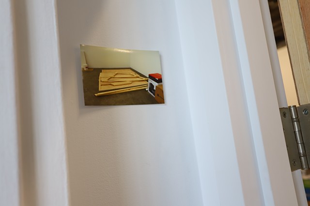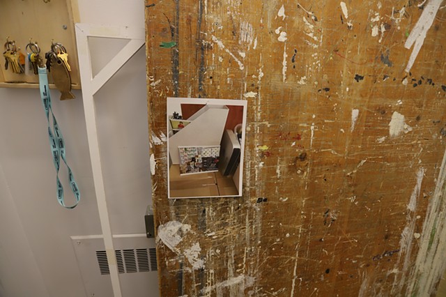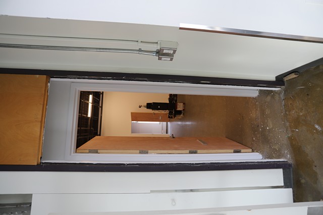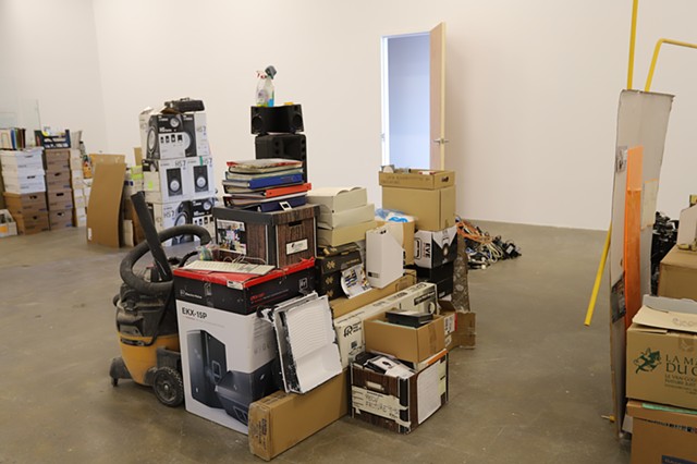 To make the exhibition I moved all of the items in the storage areas surrounding the exhibition space into the main gallery. Stacks of boxes of storage supplies, of current and obsolete technical equipment, archival materials, accounting documents, and bric-a-brac from over thirty years in the same space all came to light in the gallery. The white cube of the gallery space is constructed as an enclosure within a building that has exterior facing windows. I built doors that penetrated this envelope and provided access to the intermediary space between the gallery and the outside-facing windows. As part of this activity of bringing the structures of gallery-making and gallery-legitimating into the gallery, I also incorporated printed images that documented the gallery in previous states of disarray into the sculptural collage within the exhibition space.